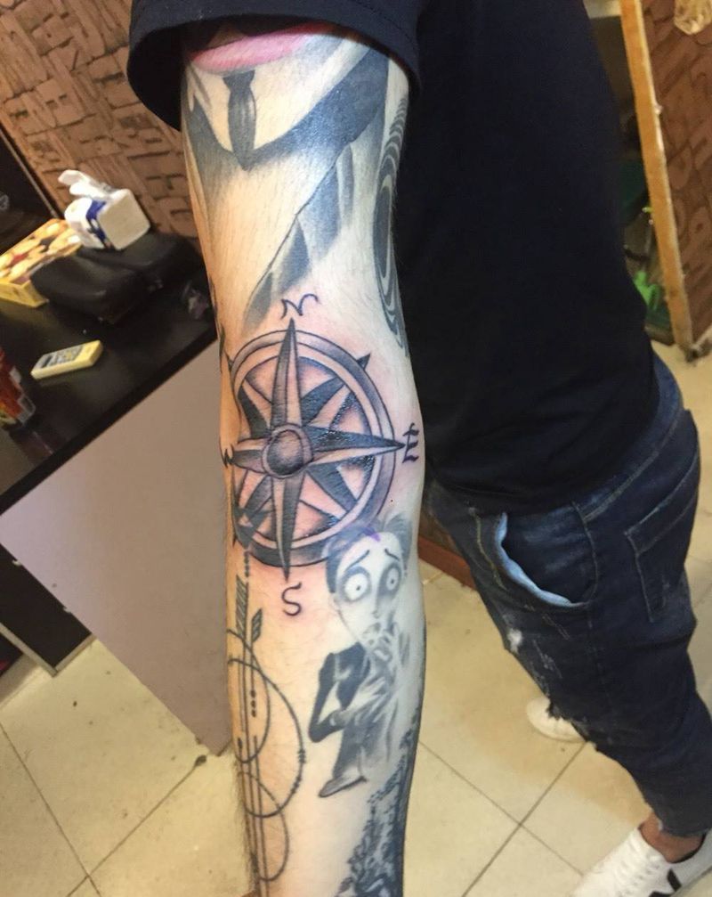 当前位置: 首页 >浙江省丽水市纹身店-金魁刺青纹身图案>胳膊肘花,指南针纹身图片_成品手臂欧美几何静物纹身图案