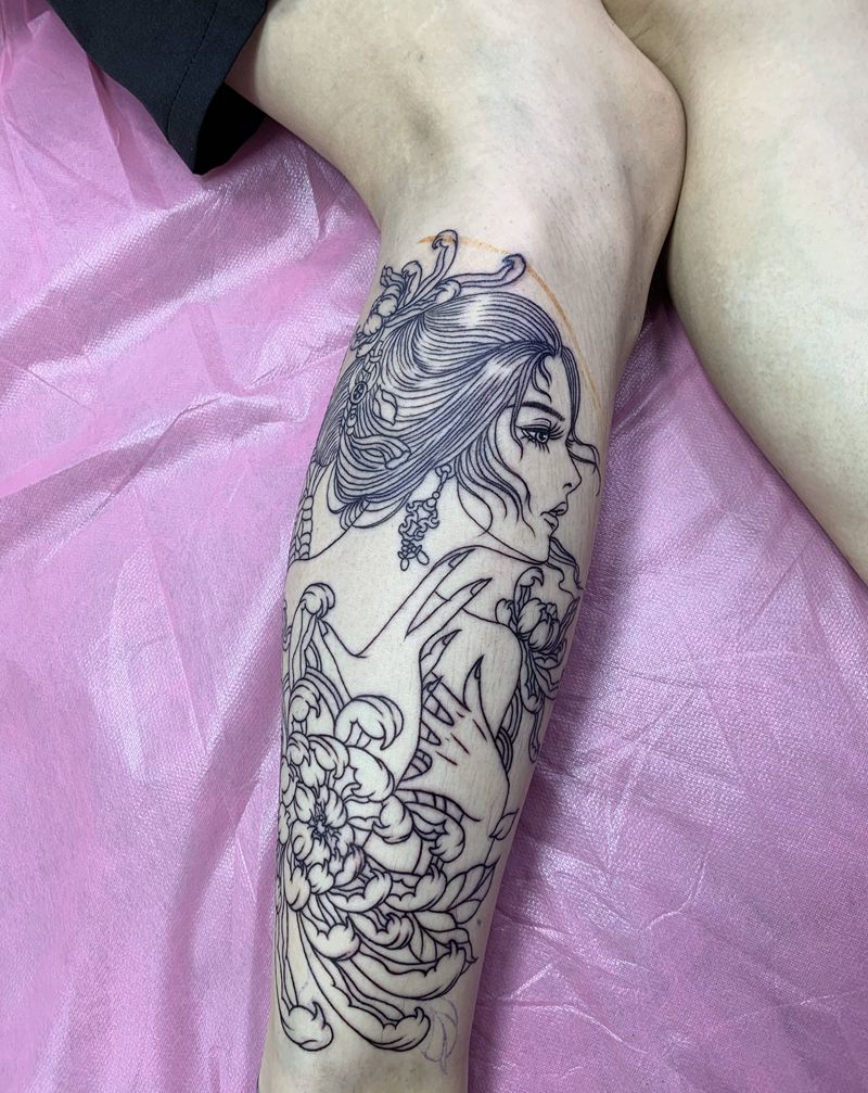 艺妓线条纹身图片_腿部新传统艺妓小腿中国风仕女纹身图案
