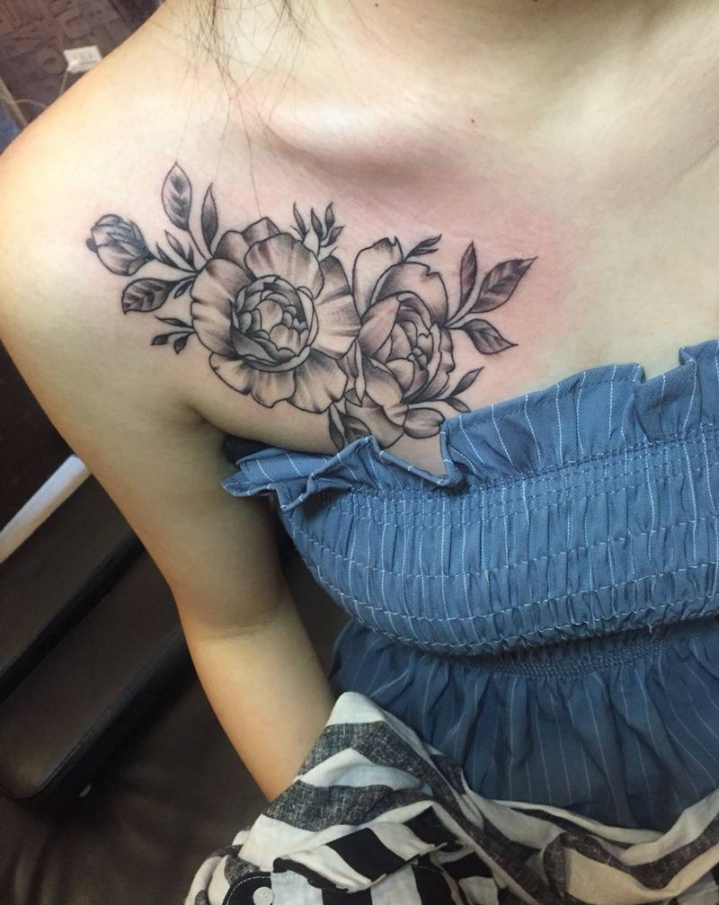 胸花,黑灰纹身图片_成品胸部清新写实植物纹身图案