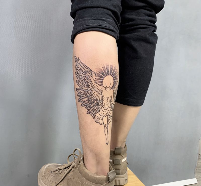 当前位置: 首页 >安徽省合肥市纹身店-丫丫刺青工作室纹身图案>堕落天使纹身图片_腿部New School天使小腿纹身图案