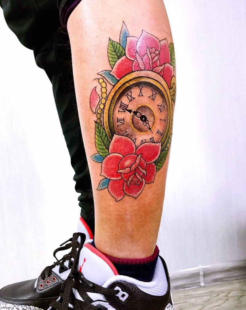 当前位置: 首页 >安徽省合肥市纹身店-丫丫刺青工作室纹身图案>小腿彩色时钟与花纹身图片_成品腿部欧美植物纹身图案