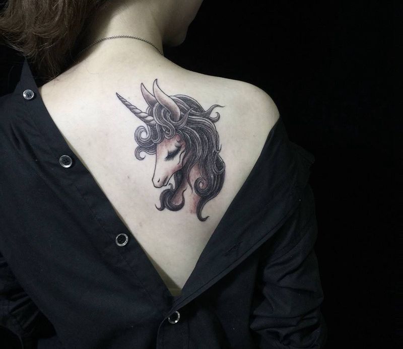 当前位置: 首页 >安徽省合肥市纹身店-丫丫刺青工作室纹身图案>肩胛独角兽黑灰立体纹身图片_成品背部欧美动物纹身图案