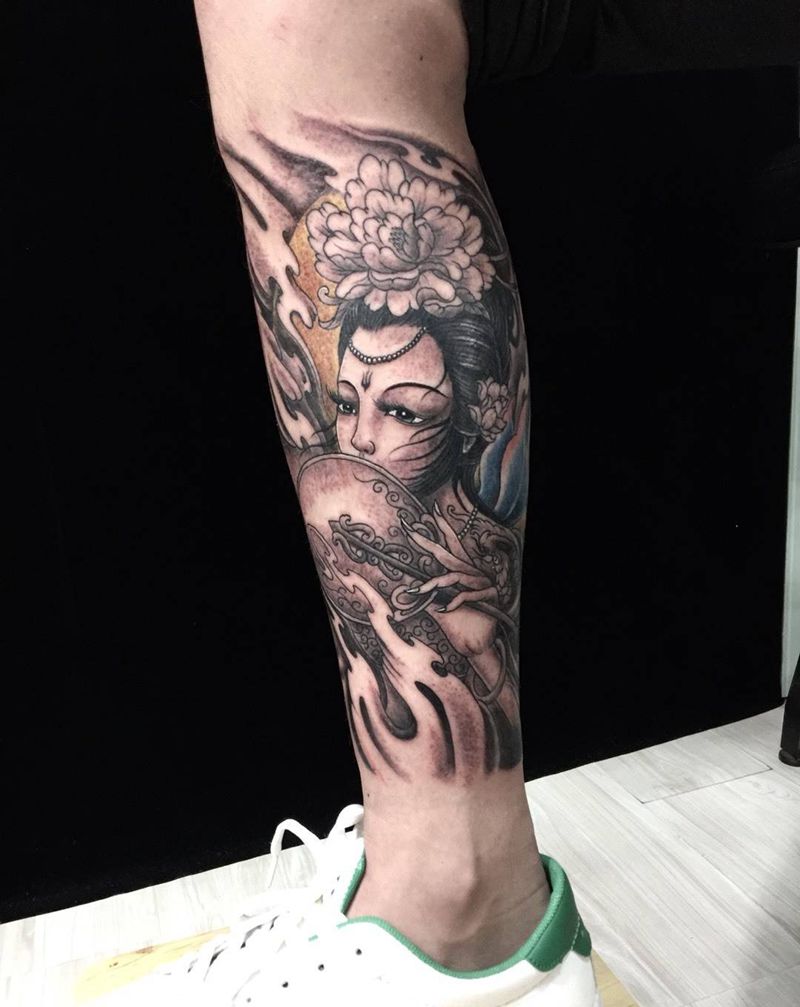 小腿纹身图片_成品腿部传统人物中国风纹身图案