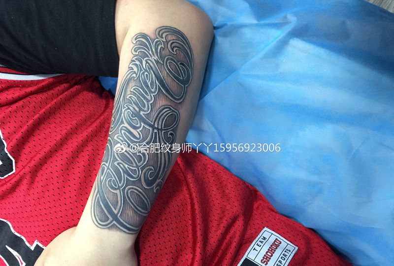 当前位置: 首页 >安徽省合肥市纹身店-丫丫刺青工作室纹身图案>手臂花体英文纹身图片_手臂Old School花体字奇卡诺纹身图案