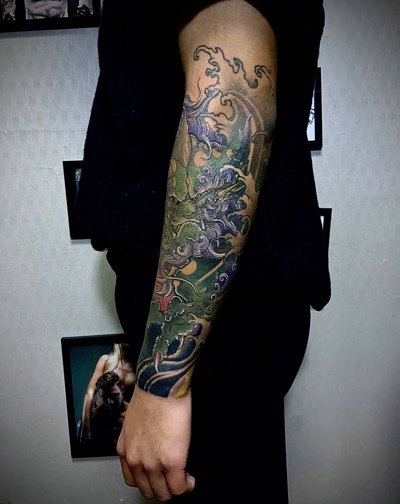 当前位置: 首页 >安徽省合肥市纹身店-夜阑刺青纹身图案>遮盖唐狮客人皮肤太暗纹身图片_手臂新传统纹身图案