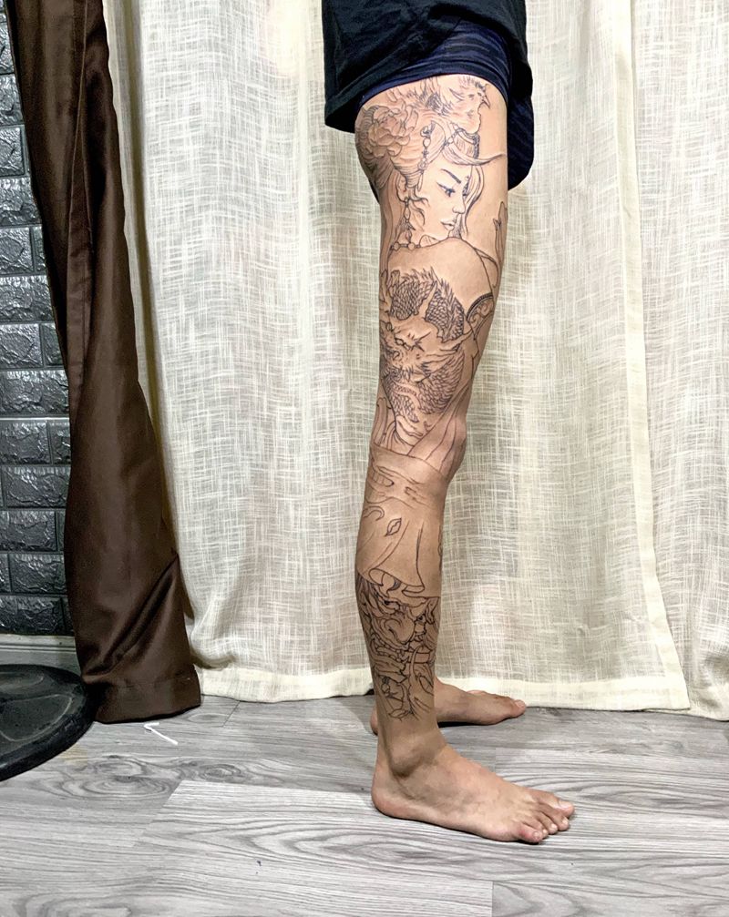 • T网红王老大花腿龙纹身图片_腿部新传统纹身图案