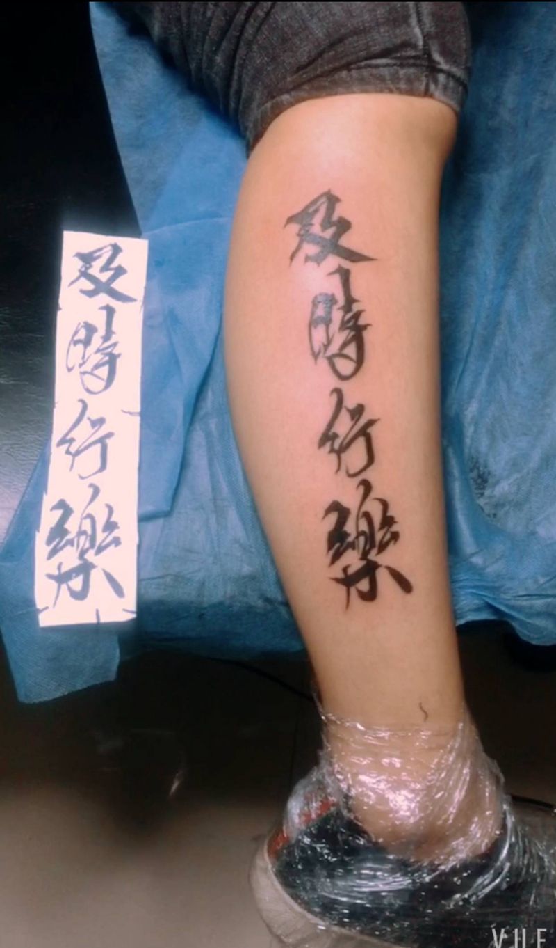 当前位置: 首页 >安徽省合肥市纹身店-老艺人刺青工作室纹身图案>小腿#及时行乐纹身图片_腿部花体字纹身图案