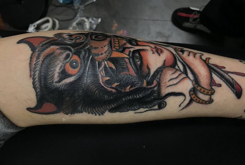 • T包小腿吹火男+阿多福纹身图片_腿部老传统新传统吹火男阿