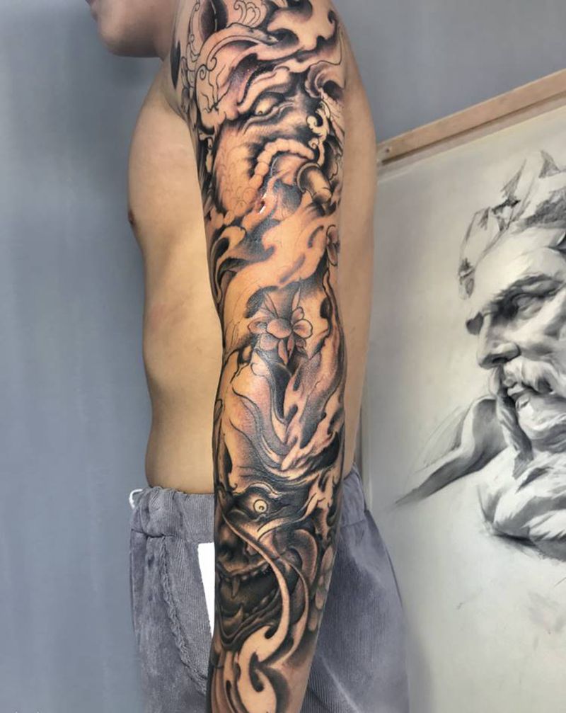 • T网红王老大花腿龙纹身图片_腿部新传统纹身图案