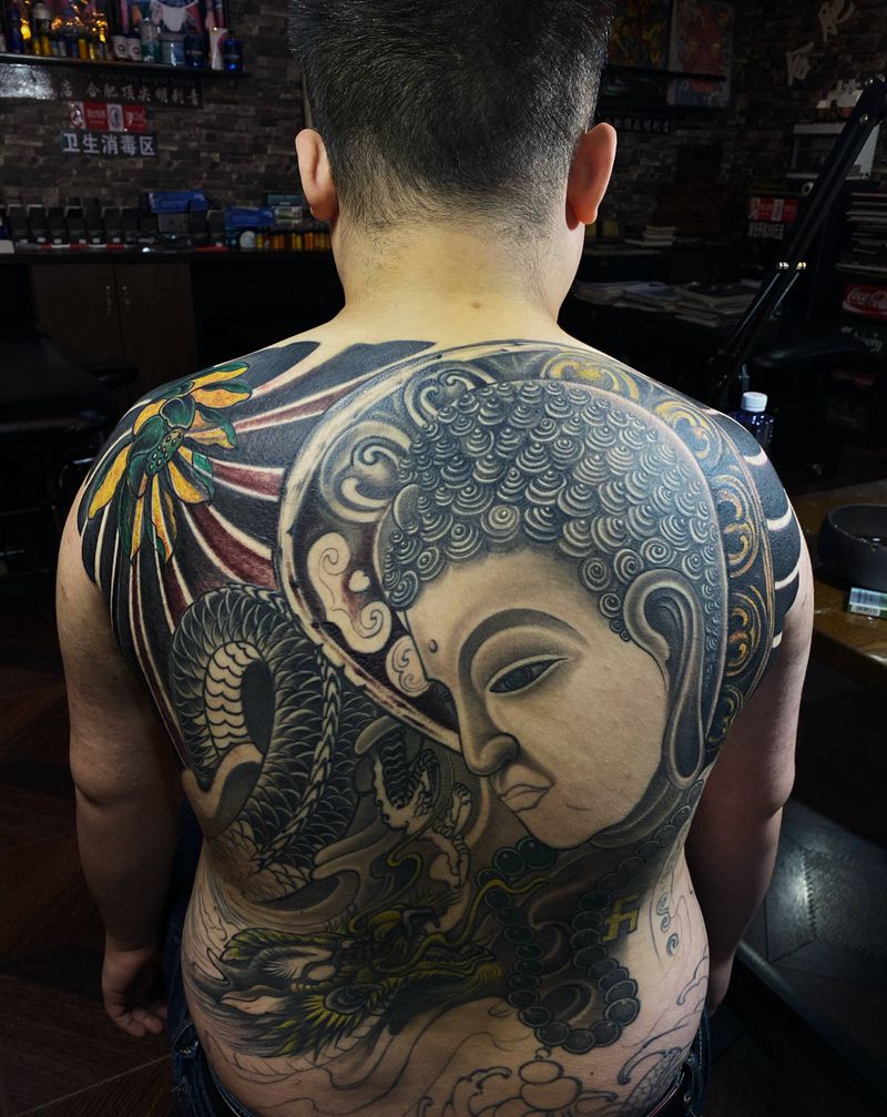 佛与龙 满背 未完成纹身图片_背部新传统纹身图案