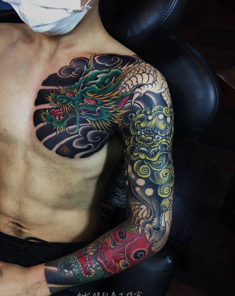 龙 唐狮 般若 花臂纹身图片_臀部手臂老传统新传统纹身图案