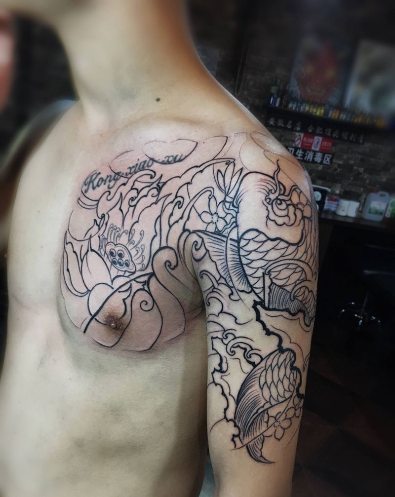 鲤鱼莲花半甲纹身图片_胸部手臂纹身图案