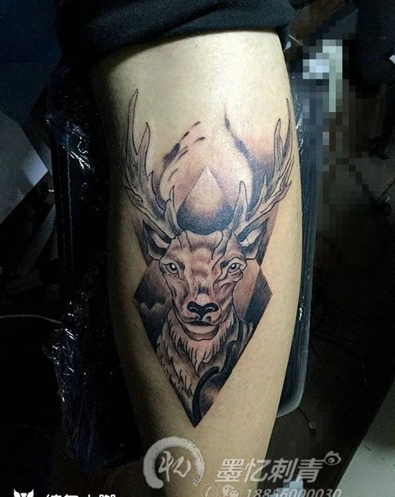 麋鹿纹身图片_成品腿部传统写实几何动物纹身图案