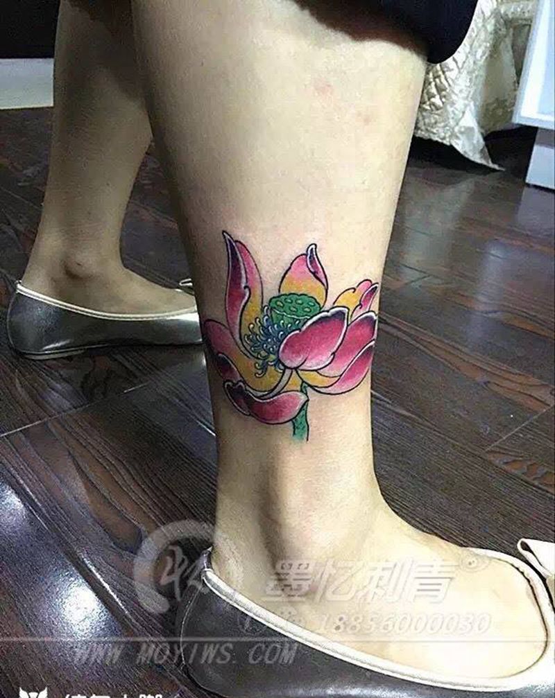 荷花纹身纹身图片_腿部成品写实清新传统植物静物原创纹身图案