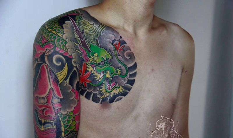 当前位置: 首页 >安徽省芜湖市纹身店-妍刺青纹身图案>半甲纹身图片_手臂胸部老传统新传统般若龙纹身图案