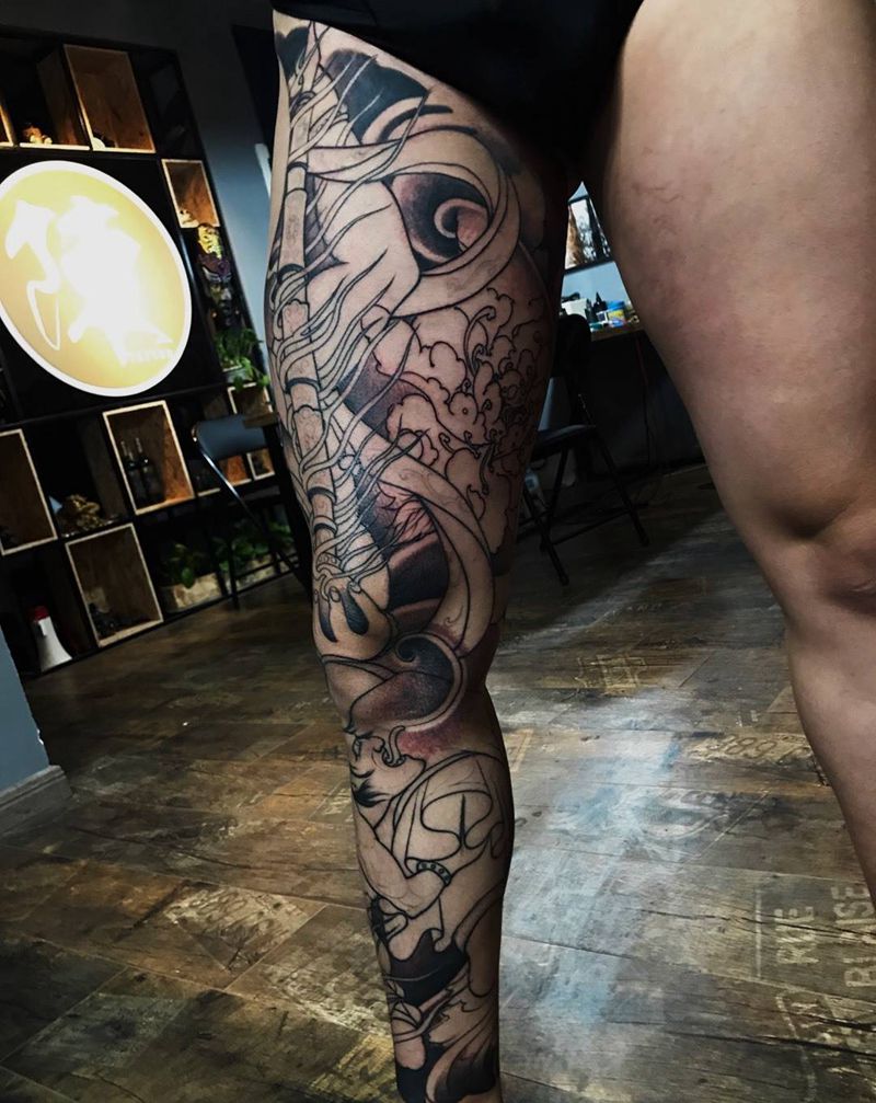 • T网红王老大花腿龙纹身图片_腿部新传统纹身图案