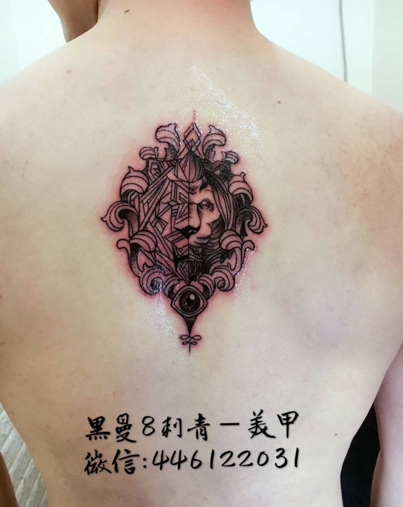 当前位置: 首页 >安徽省合肥市纹身店-黑曼8Tattoo纹身图案>狮子座男孩纹身图片_成品背部欧美动物几何纹身图案