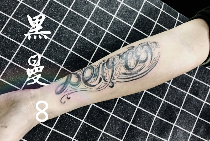 当前位置: 首页 >安徽省合肥市纹身店-黑曼8Tattoo纹身图案>遮盖纹身图片_手臂花体字奇卡洛遮盖纹身图案