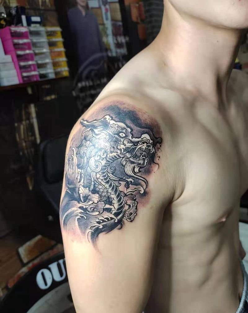 当前位置: 首页 >安徽省芜湖市纹身店-芜湖市永义堂刺青纹身店纹身图案>龙纹身图片_腿部手臂新传统水墨纹身图案