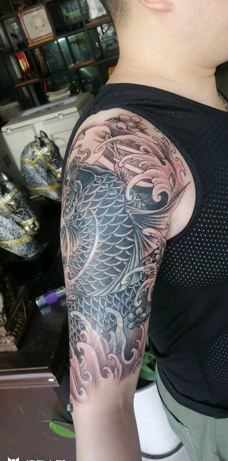 当前位置: 首页 >安徽省芜湖市纹身店-芜湖市永义堂刺青纹身店纹身图案>鲤鱼盖一个很大图腾龙纹身图片_手臂腿部老传统新传统纹身图案