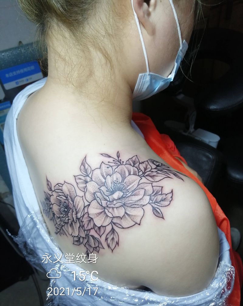 素花纹身图片_肩部胸部点刺水墨纹身图案