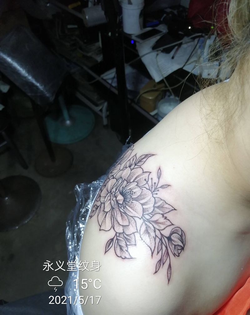 素花纹身图片_肩部胸部点刺水墨纹身图案