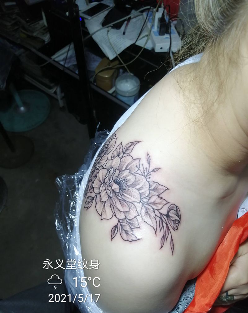 素花纹身图片_肩部胸部点刺水墨纹身图案