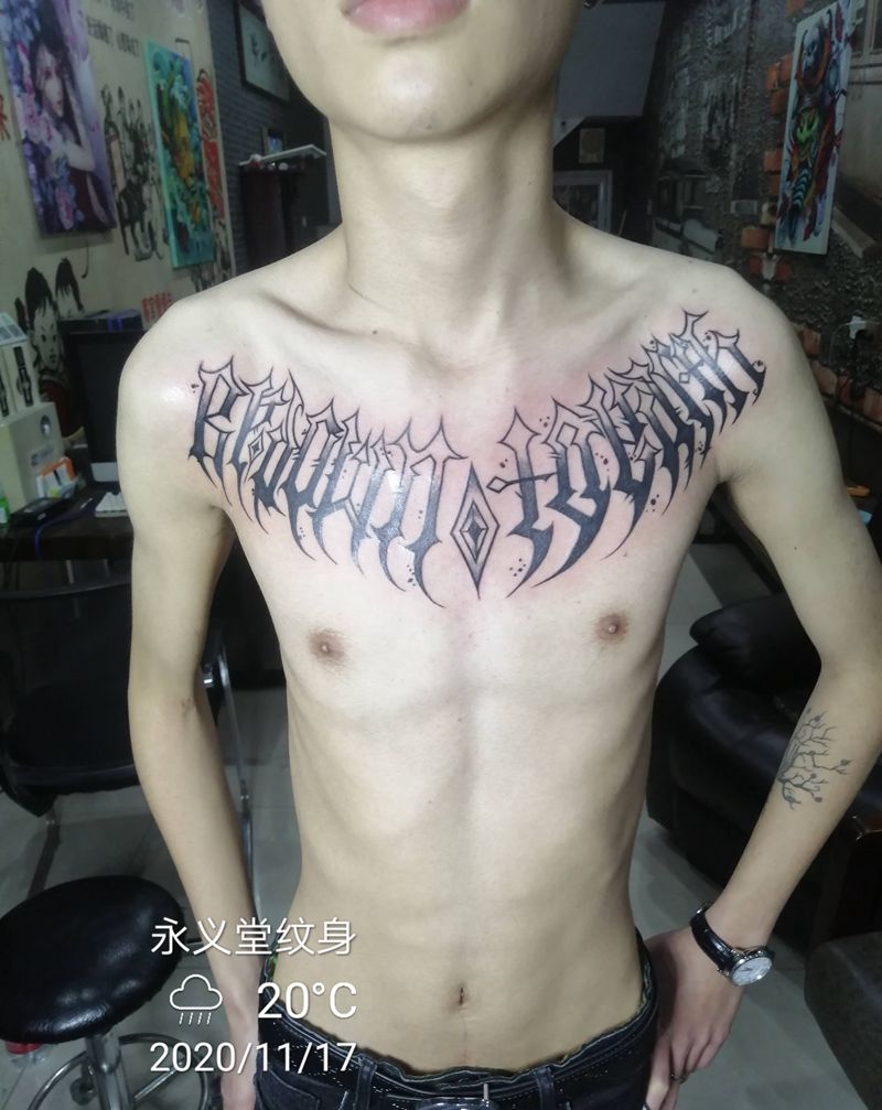 当前位置: 首页 >安徽省芜湖市纹身店-芜湖市永义堂刺青纹身店纹身图案>花体字母纹身图片_胸部肩部新传统花体字纹身图案