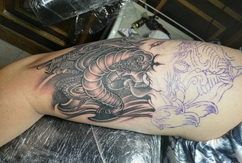 当前位置: 首页 >安徽省芜湖市纹身店-芜湖市永义堂刺青纹身店纹身图案>象神进行中。纹身图片