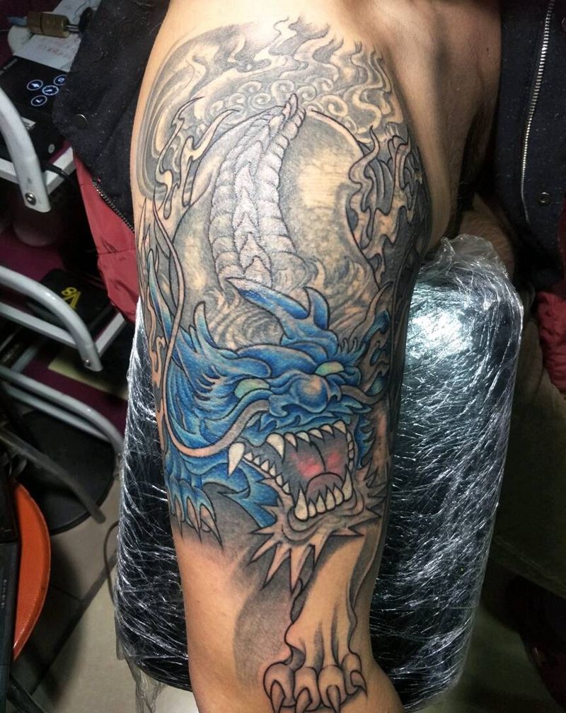 • T网红王老大花腿龙纹身图片_腿部新传统纹身图案