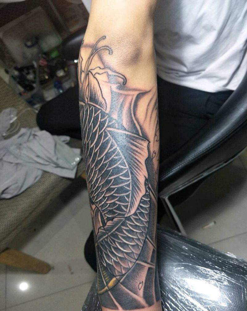 当前位置: 首页 >安徽省芜湖市纹身店-芜湖市永义堂刺青纹身店纹身图案>鲤鱼线条修改加上色,纹身图片