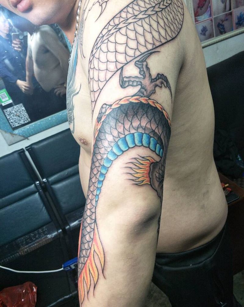 • T网红王老大花腿龙纹身图片_腿部新传统纹身图案