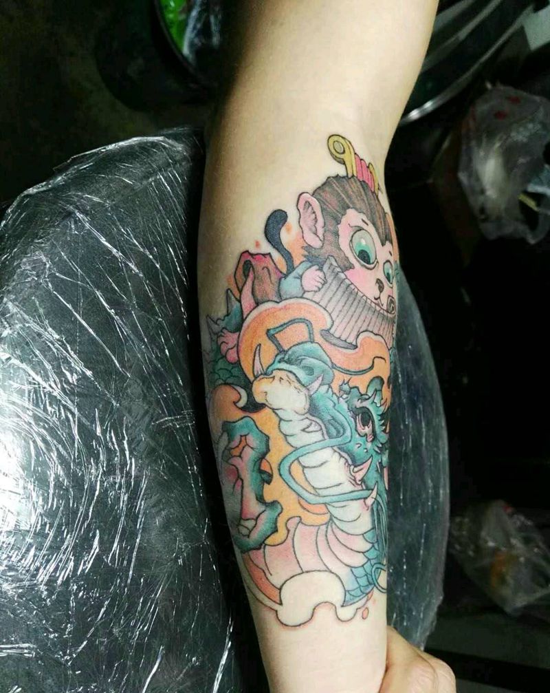 • T网红王老大花腿龙纹身图片_腿部新传统纹身图案
