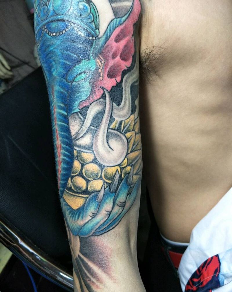 • T网红王老大花腿龙纹身图片_腿部新传统纹身图案