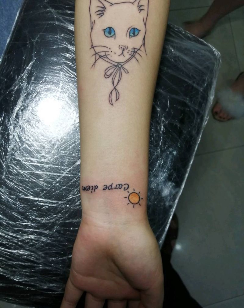 当前位置: 首页 >安徽省芜湖市纹身店-芜湖市永义堂刺青纹身店纹身图案>小图纹身图片_手臂腿部花体字新传统猫字母永义堂纹身图案