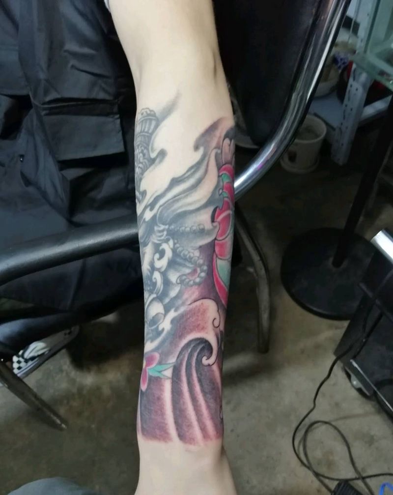 当前位置: 首页 >安徽省芜湖市纹身店-芜湖市永义堂刺青纹身店纹身图案>荷花包臂纹身图片_手臂腿部新传统老传统纹身图案