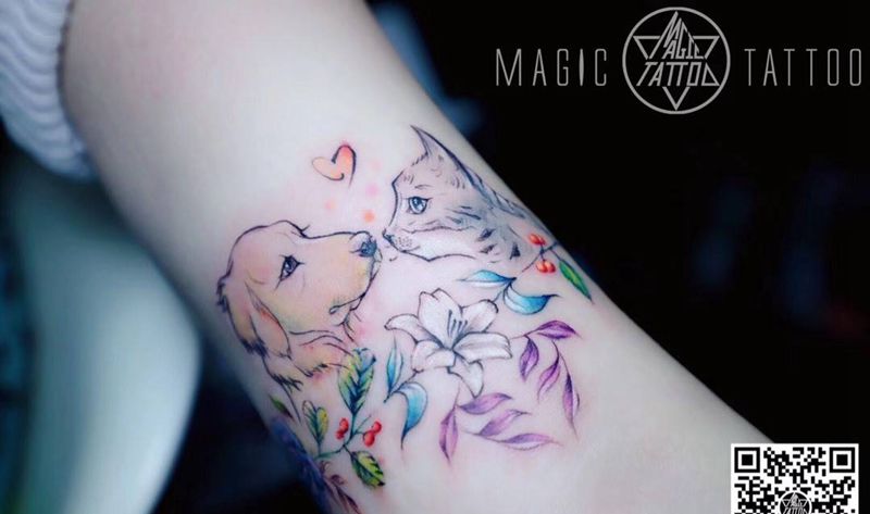 当前位置: 首页 >安徽省蚌埠市纹身店-魔法刺青MagicTattoo纹身图案>小喵和小汪的爱情纹身图片_手臂水墨水彩狗猫臂环纹身图案