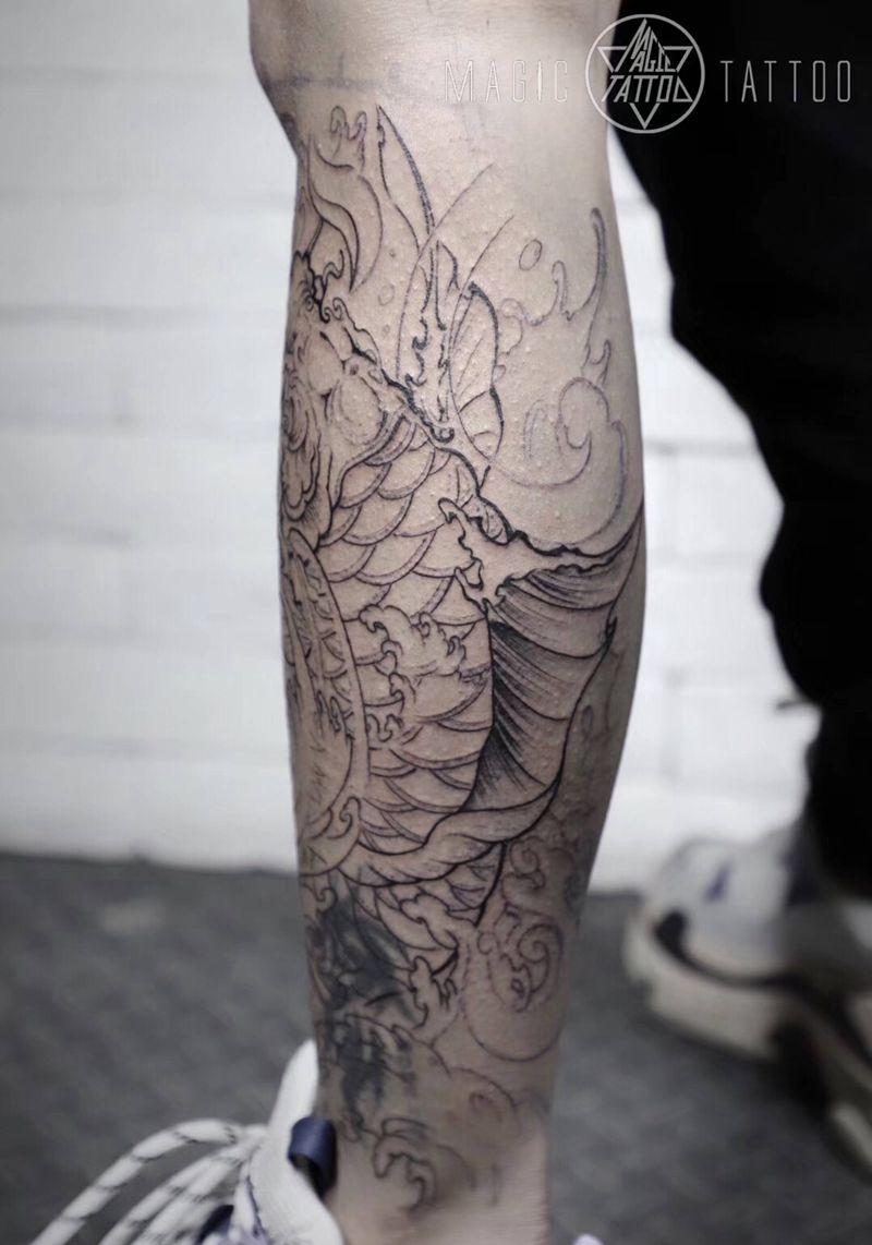 图腾遮盖,线条完成纹身图片_腿部新传统遮盖锦鲤纹身图案