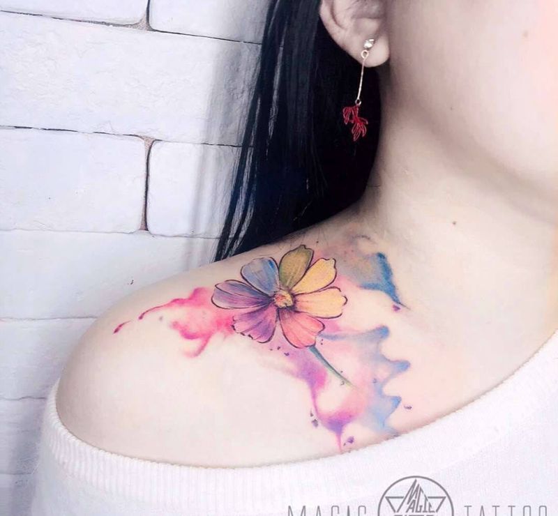 七色花遮盖纹身图片_肩部水彩七色花纹身图案