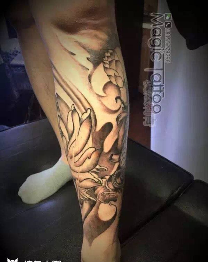 象神莲花包小腿纹身图片_腿部传统鬼神蚌埠纹身图案