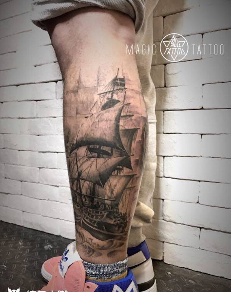 前三张为恢复后,最后一张为新鲜出炉纹身图片_成品腿部欧美写实蚌埠灯塔帆船海鸥地图经纬线纹身图案