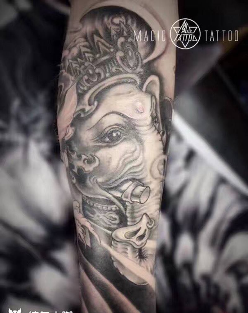 当前位置: 首页 >安徽省蚌埠市纹身店-魔法刺青MagicTattoo纹身图案>象神莲花包小腿纹身图片_成品腿部传统鬼神植物蚌埠莲花象神黑灰纹身图案