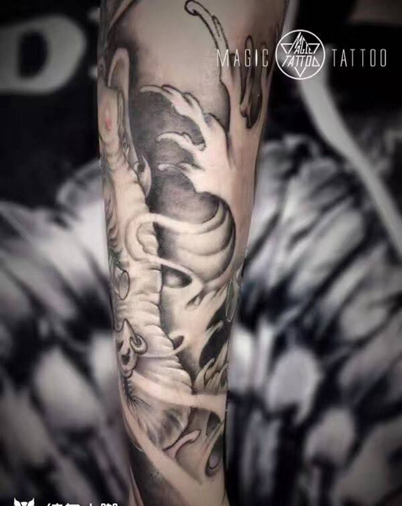 当前位置: 首页 >安徽省蚌埠市纹身店-魔法刺青MagicTattoo纹身图案>象神莲花包小腿纹身图片_成品腿部传统鬼神植物蚌埠莲花象神黑灰纹身图案