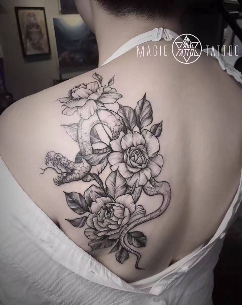 蛇恋花纹身图片_成品背部清新动物植物唯美蛇牡丹纹身图案