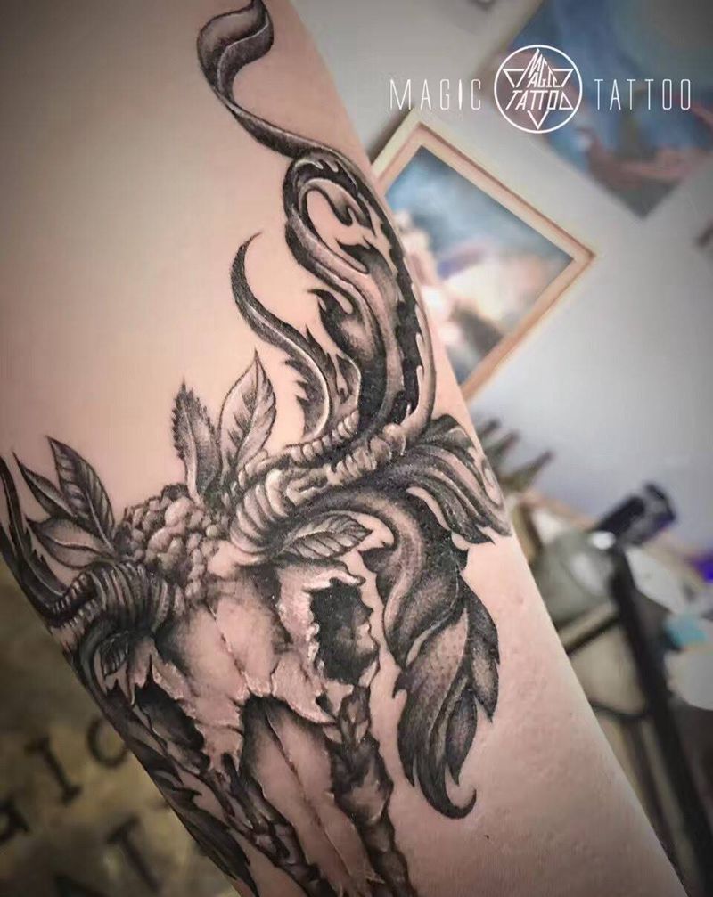 骨纹身图片_成品手臂动物蚌埠头骨鹿纹身图案