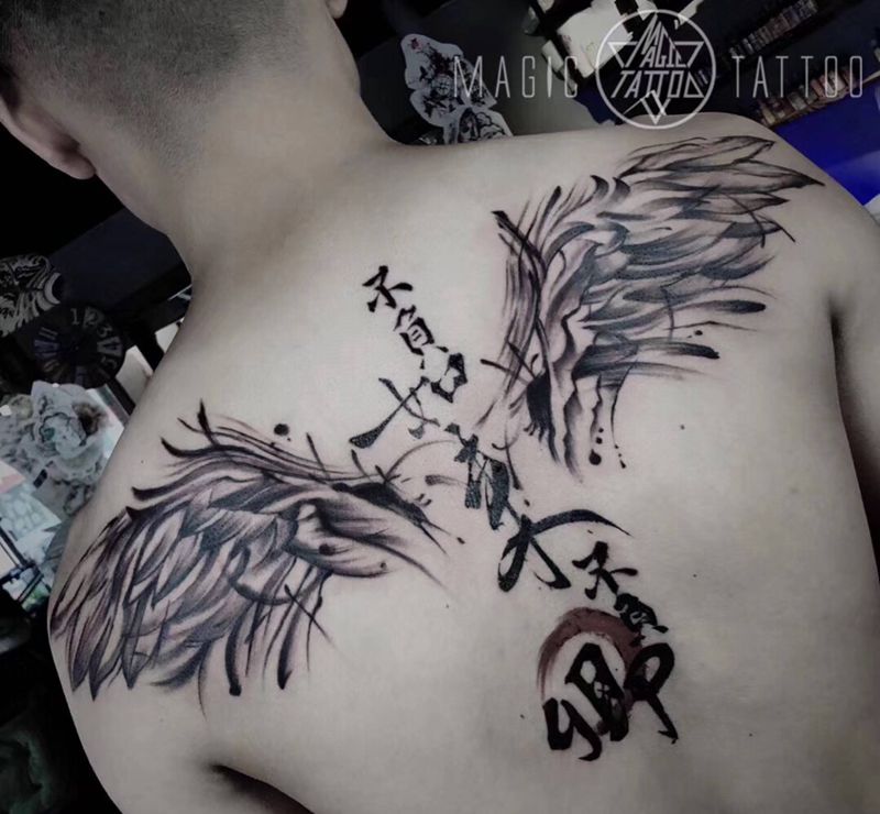 当前位置: 首页 >安徽省蚌埠市纹身店-魔法刺青MagicTattoo纹身图案>不负如来不负卿纹身图片_背部水墨翅膀纹身图案