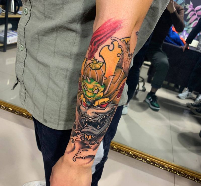 当前位置: 首页 >安徽省合肥市纹身店-本格刺青纹身图案>彩色鬼武士小臂纹身图片
