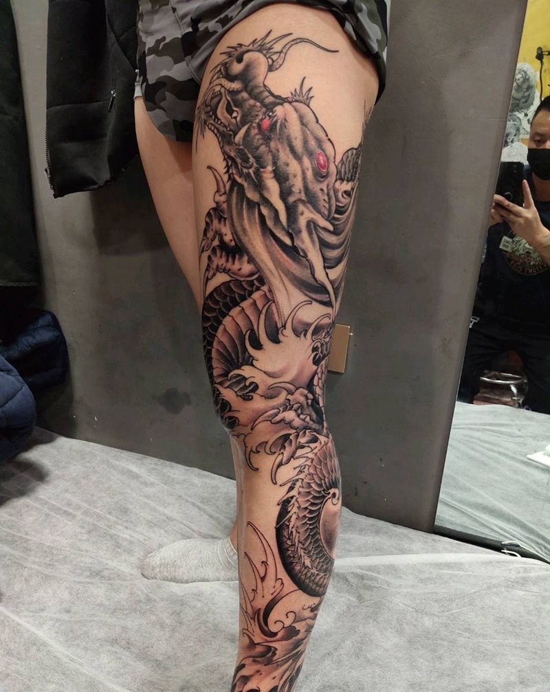 • T网红王老大花腿龙纹身图片_腿部新传统纹身图案