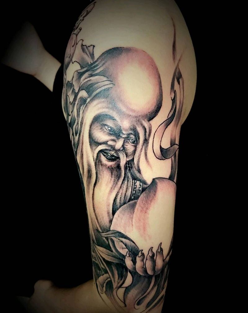 当前位置: 首页 >安徽省芜湖市纹身店-芜湖刺客纹身纹身图案>人物寿星纹身图片_手臂手部传统写实人物成品插画纹身图案