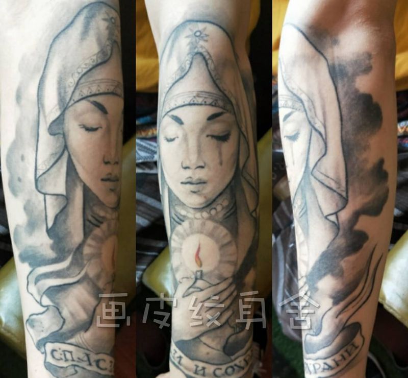 圣母包小臂待完成纹身图片_手臂肖像写实人物原创纹身图案